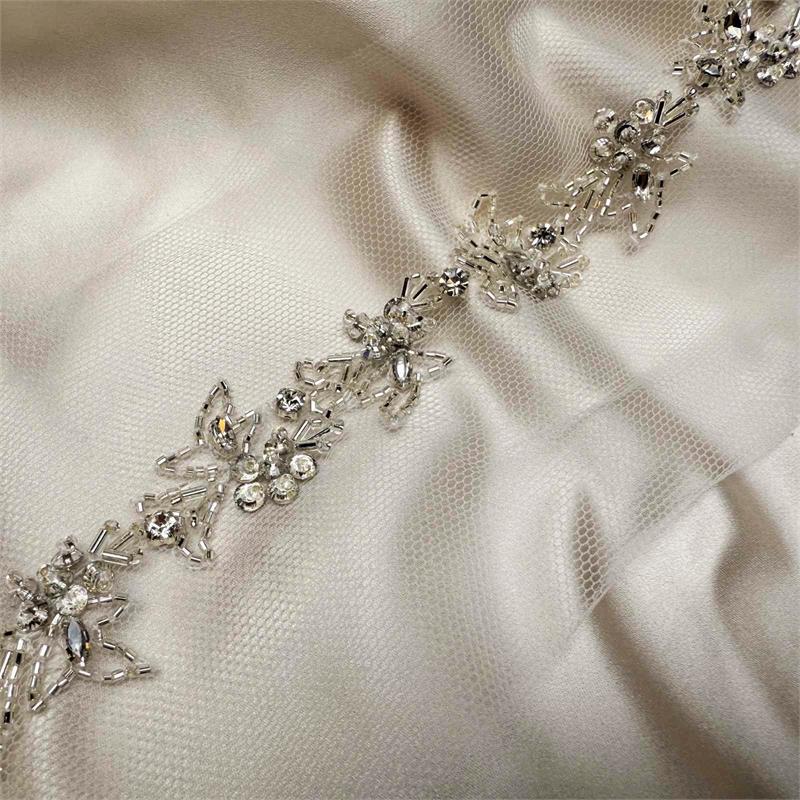 Fine Silver Hand Beaded Indian Trimming 25mm Beaded trim on sheer 8cm tulle.