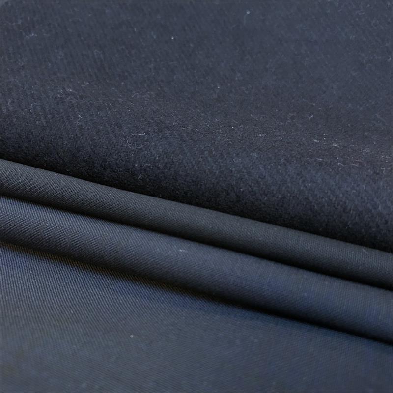 100% fine Italian wools with a reverse teflon coating for rainwear. Lighter weight navy has a subtle black check.