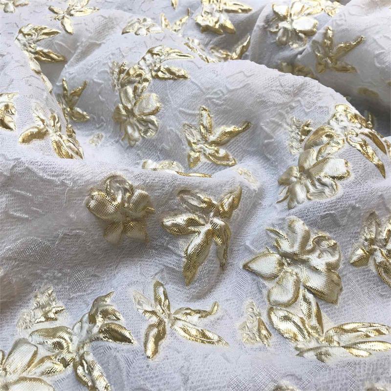Italian floral cloqué organza, with metallic details. 49% polyester, 25% silk, 18% polyamide, 8% metallic.