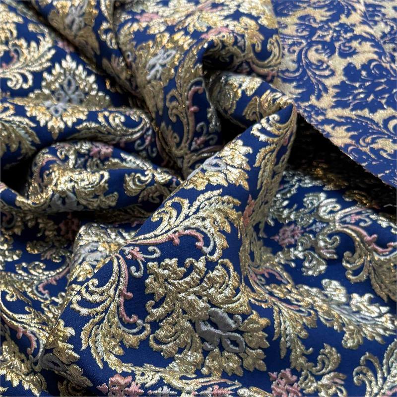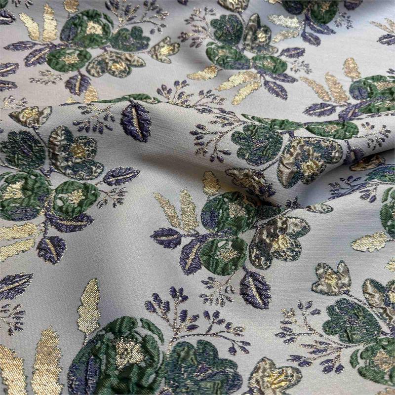 Mixed fibres metallic cloqué damasks. Blue/gold design is 'Rococco', green floral is 'Green'.
