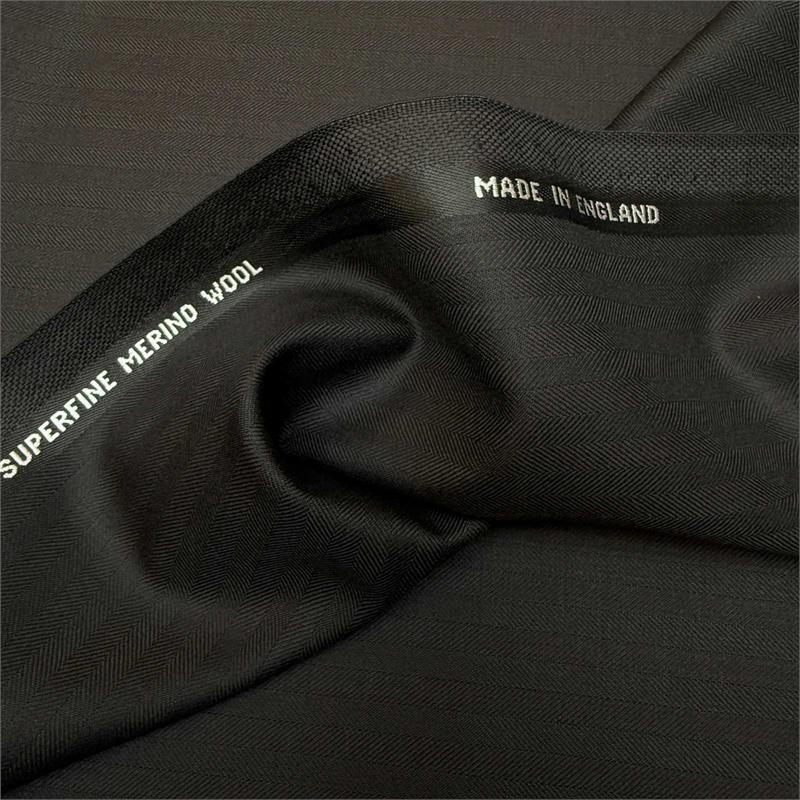 173gms 100% wool, UK made, named selvedge Super 130s black herringbone suiting.
