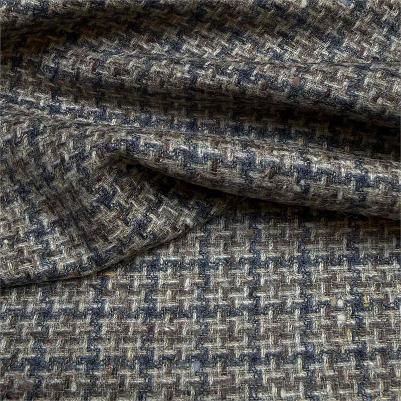 90% virgin wool 10% cashmere tweed. Grey, brown & beige check. Italian.