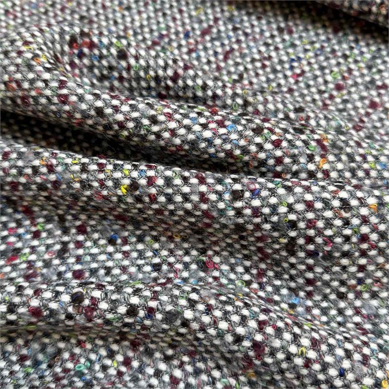 85% virgin wool 15% cotton. Multi colour boucle tweed. Italian