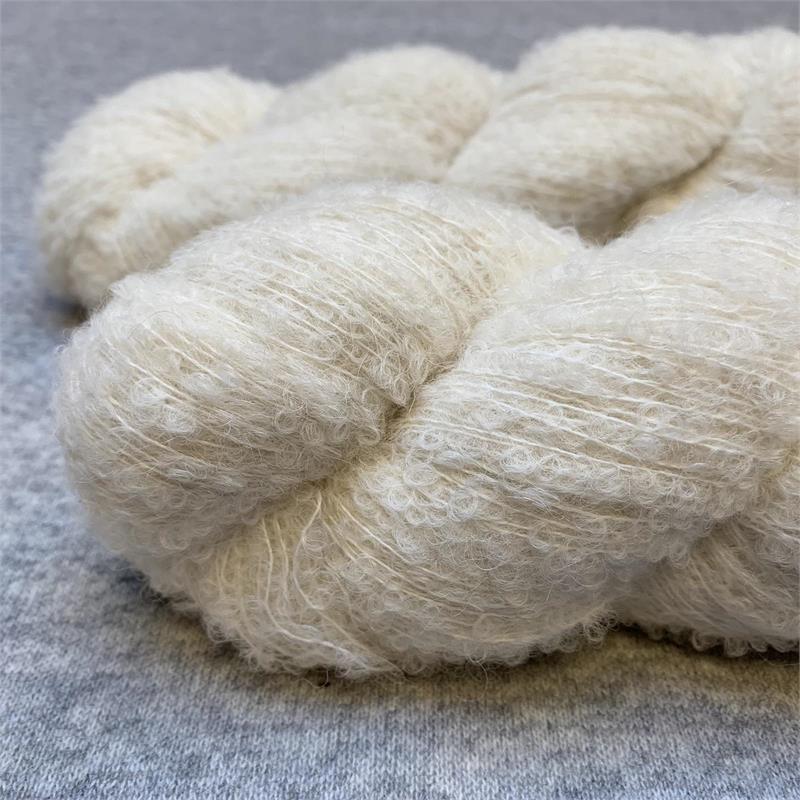 100g = 800m Undyed and ready for dyeing 81% superfine alpaca/19% polyamide lace bouclé. 1/8nm.