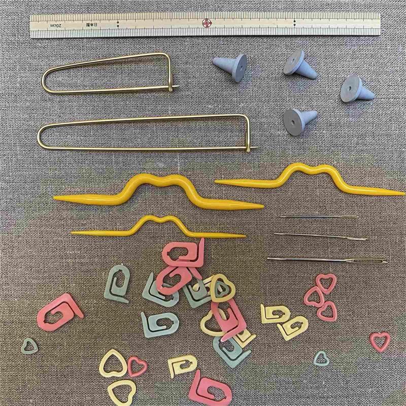 Set contains rubber point protectors size M, yarn darning needles x 3, stitch markers x 30, cable stitch holders x 3, aluminium stitch holders x 2, bamboo ruler 20cm. This item is discontinued and available only while stocks last.