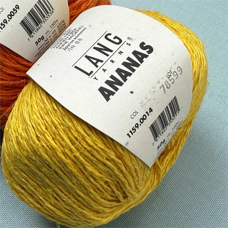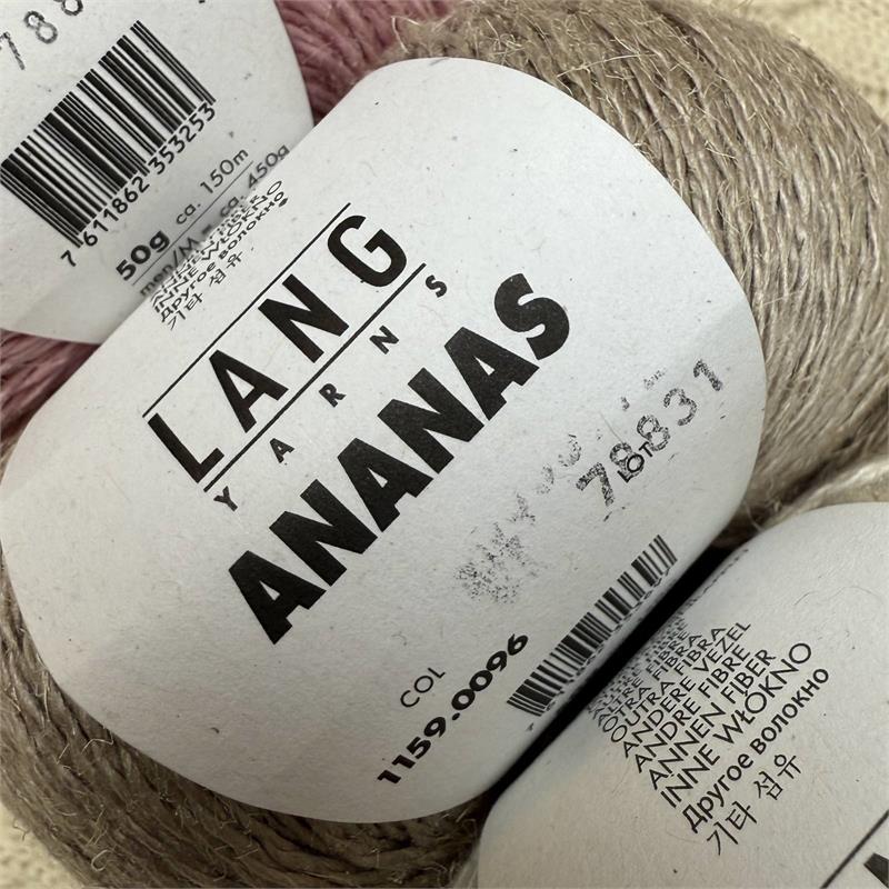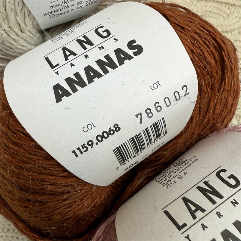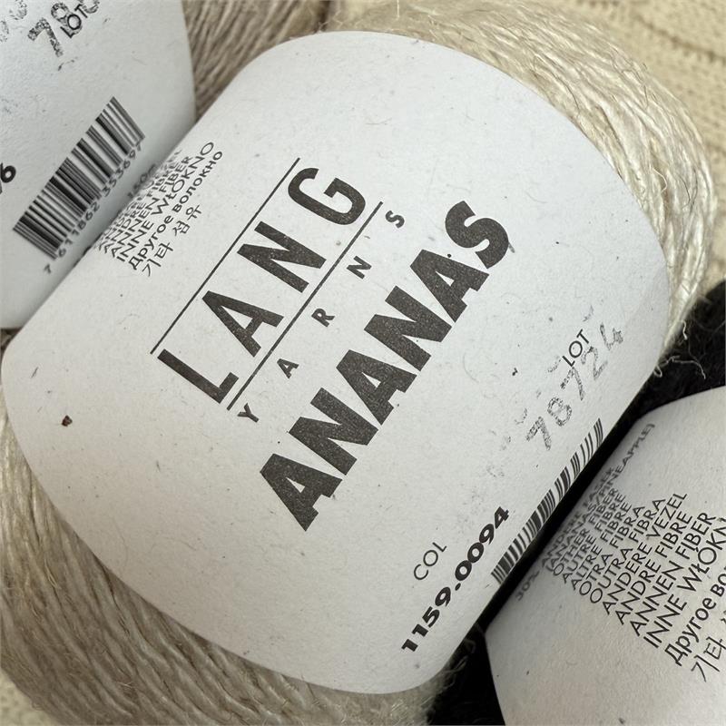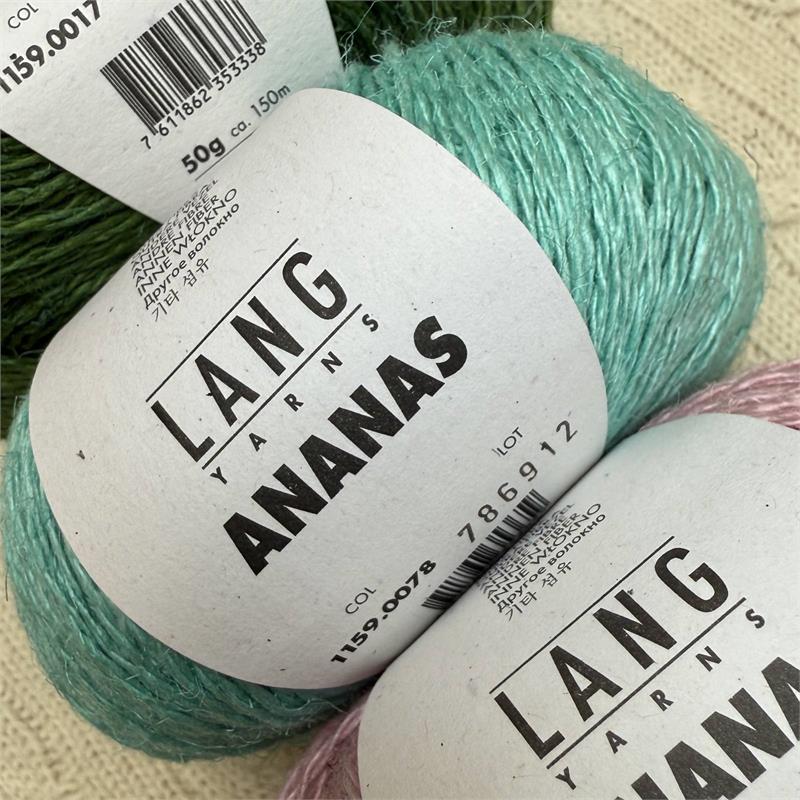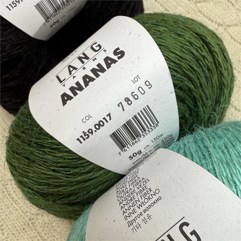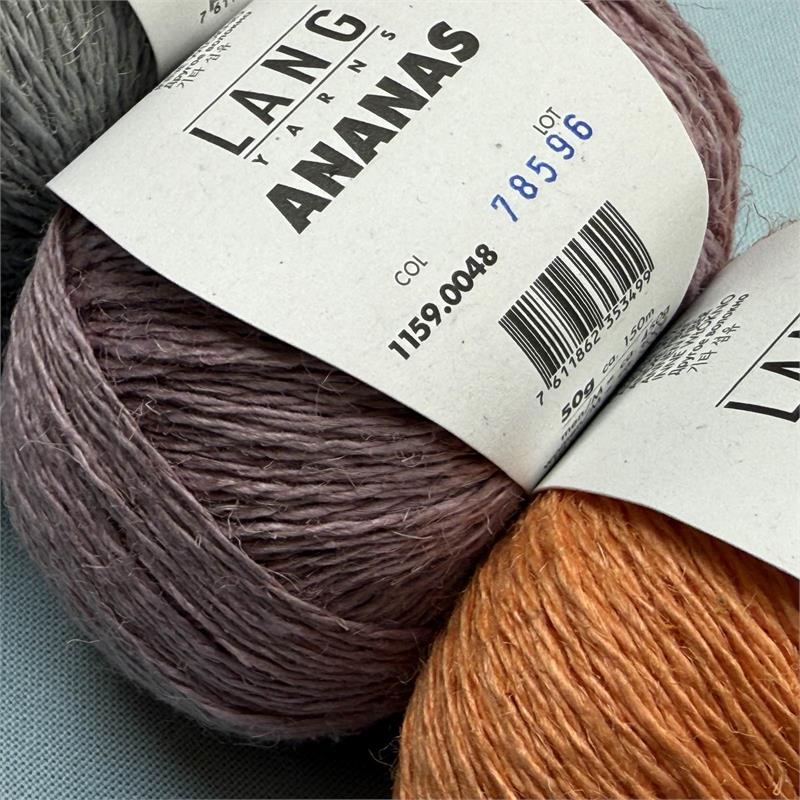 50g = 150m 70% Lyocell/30% Pineapple Fibre. Needle sizes 4.00-4.50mm. Machine washable wool wash at 30 degrees. 10cm = 20 stitches x 28 rows.