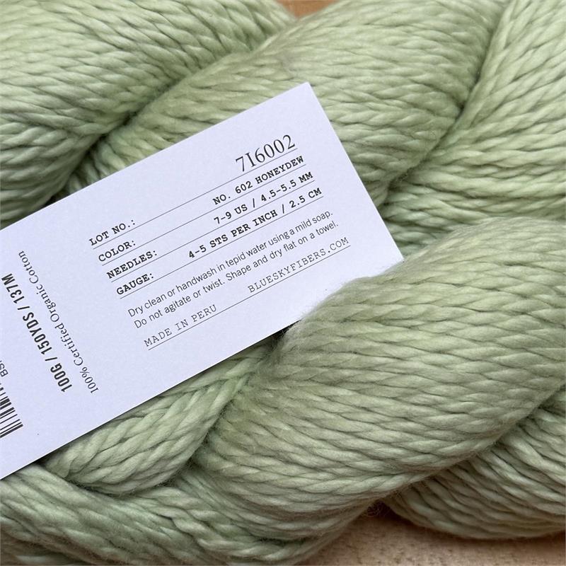 100g = 137m 100% Organic Cotton Worsted. Dry Clean or Handwash - Cold. Needles 4.5mm - 5.5mm. 10cm = 2-25 stitches.