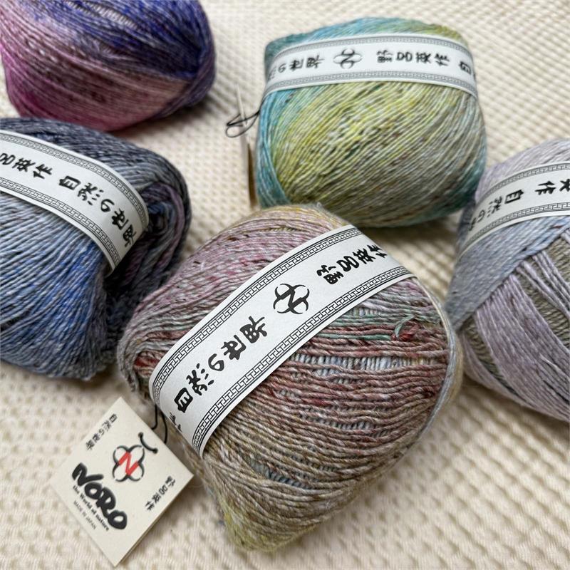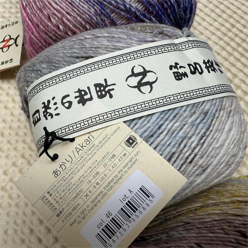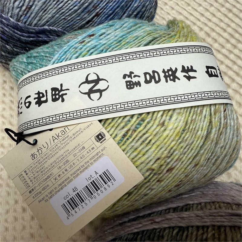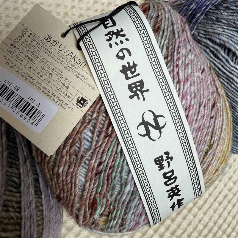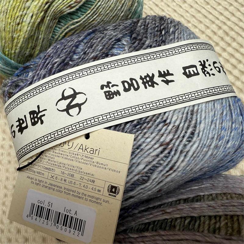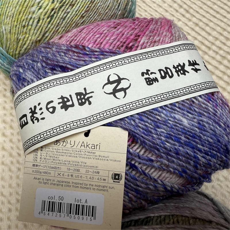 Noro Akari - 200g - 485m 26% Silk, 21% Cotton, 15% Viscose, 14% Kid Mohair, 12% Wool, 12% Polyamide. 4.5mm to 5.5mm needles. 10cm = 16 stitches x 20 rows.
