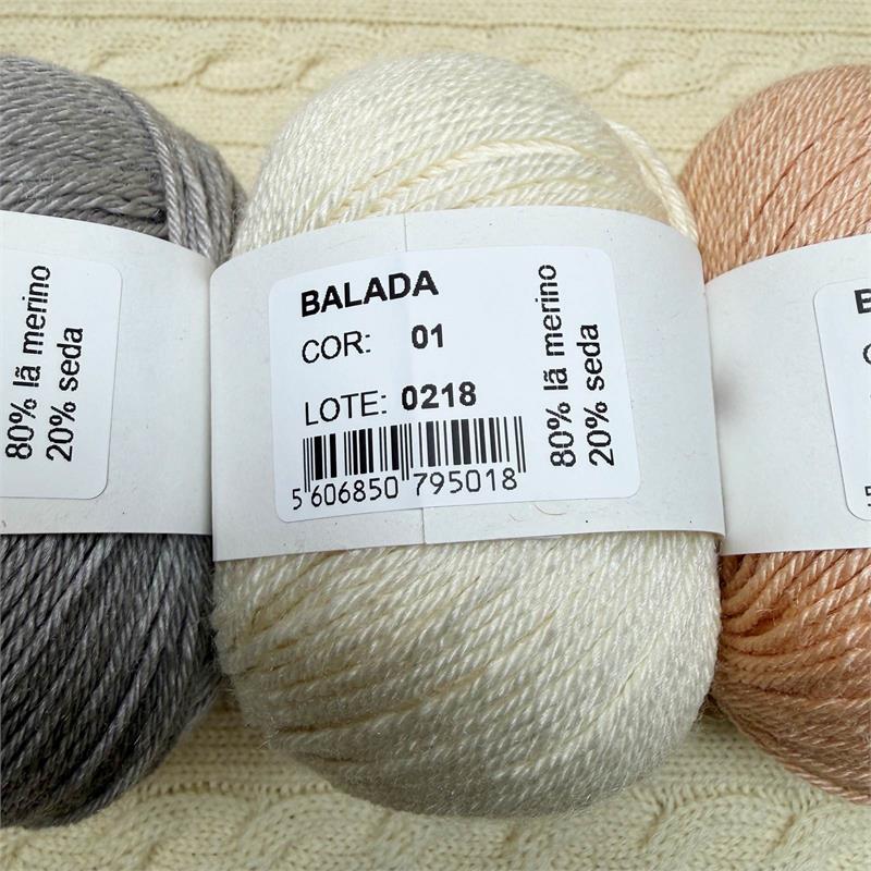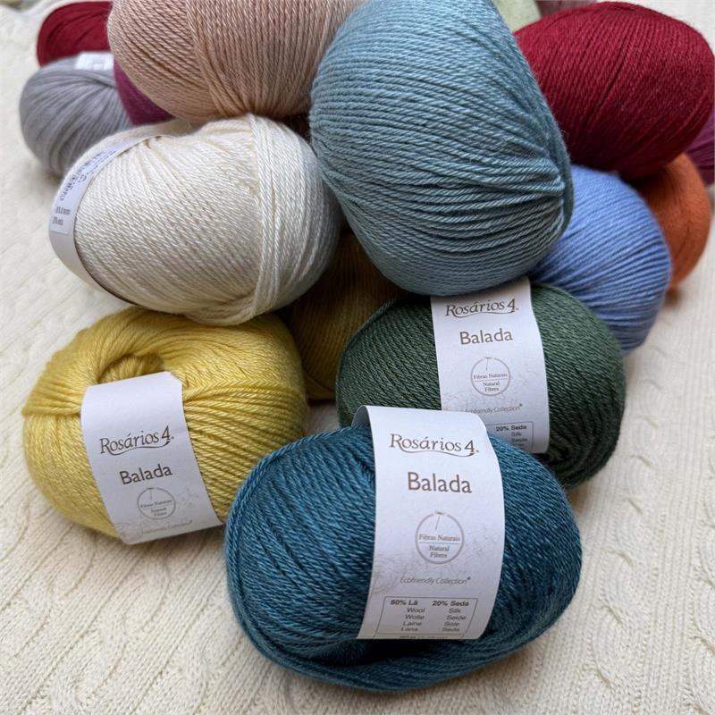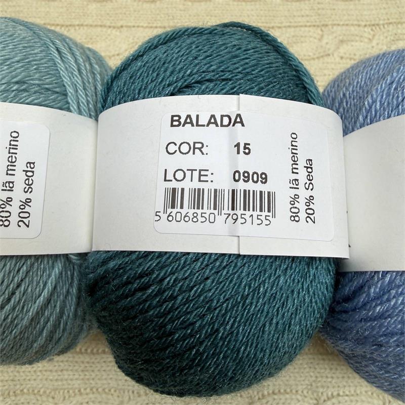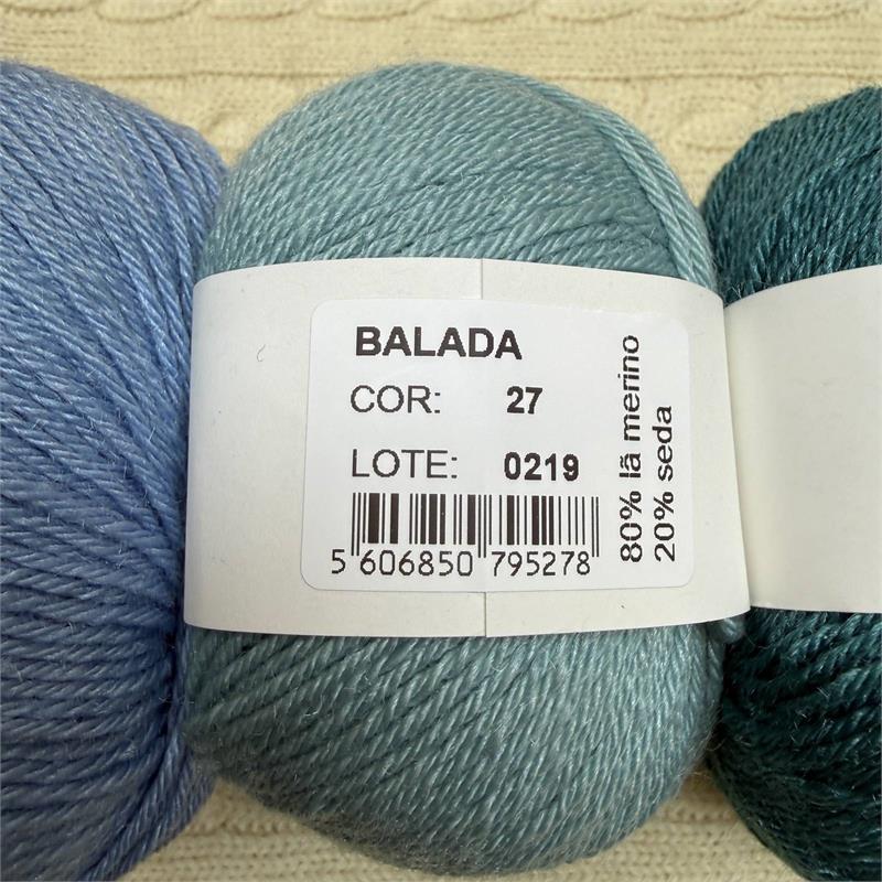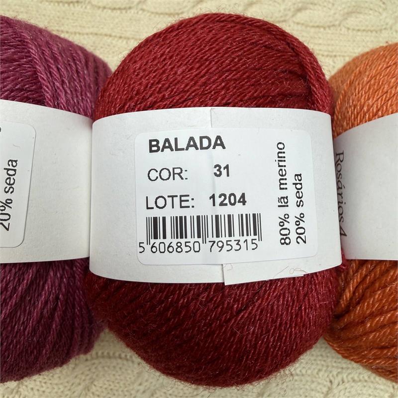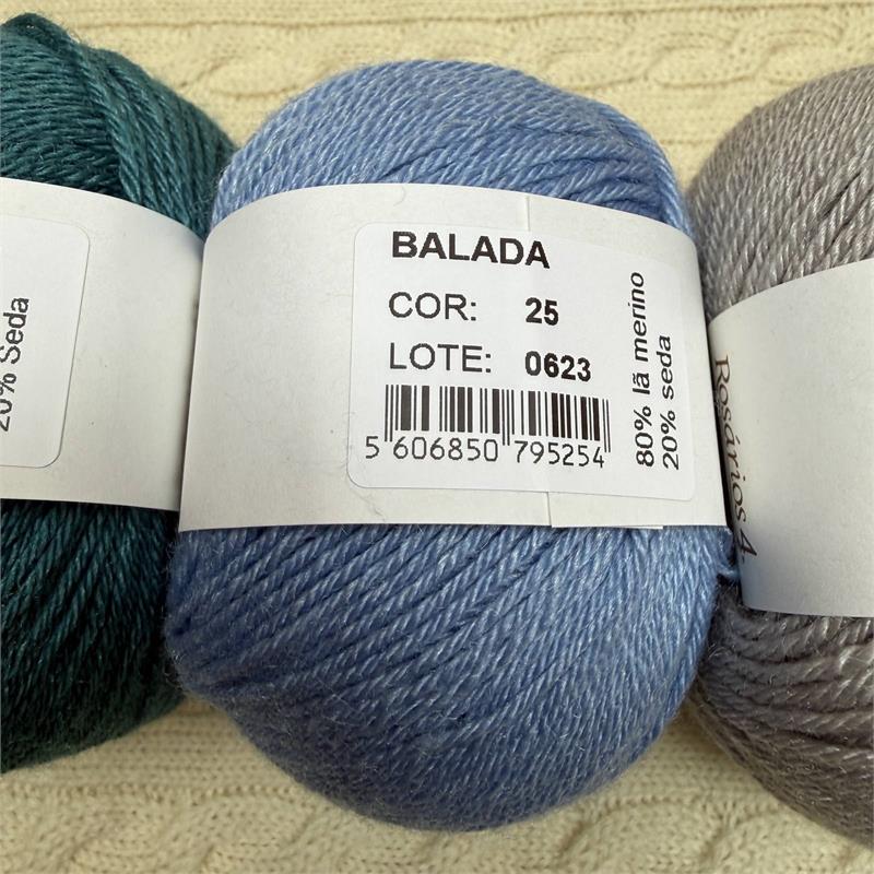 50g = 140m 80% Merino/20% Silk. Hand wash. Needles 3mm-3.5mm. 10cm = 21 stitches x 31 rows.