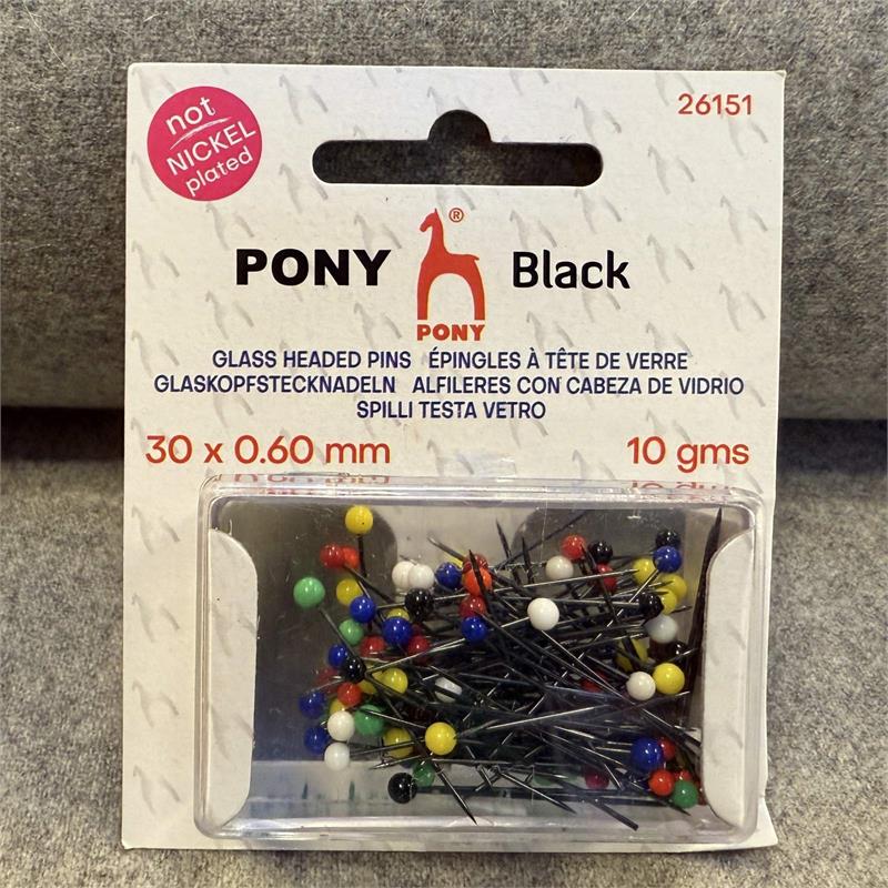 Pony Black Glass Head Pins 34mmx0.60mm - 10g These Black pins have a matt black finish, which is easier on the eyes than a shiny pin. They are made from hardened high-carbon steel. They are nickel free and have a razor sharp tip that glides easily through fabric. The pins have a coloured head, making them highly visible and easy to find in your work.