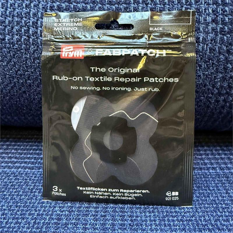 Prym Rub on Patch Repair Kit Pack of 3 Self-adhesive patches for stretch and non-stretch textiles Bi-elastic: stretches in all directions, prevents tearing during wear Easy to apply Ñ no sewing or ironing required Made from 100% recycled polyester, washable up to 40Ê¡C, ironable up to 160Ê¡C Three patches per pack in assorted sizes.