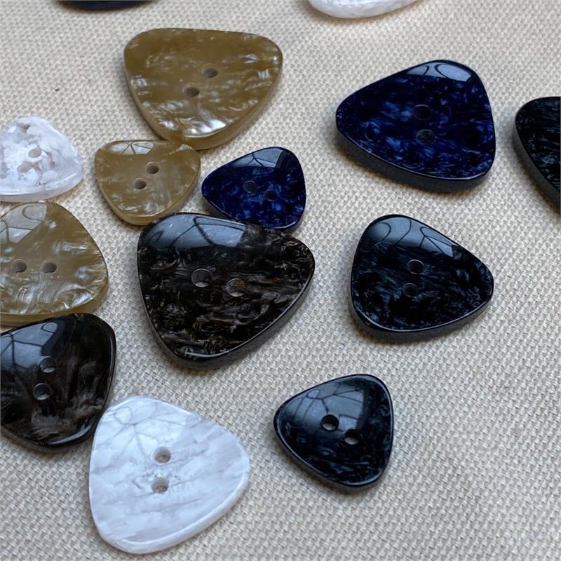 Triangle 2-Hole Polyester Buttons. Sz28 = 18mm, Sz36 = 23mm and Sz44 = 28mm.