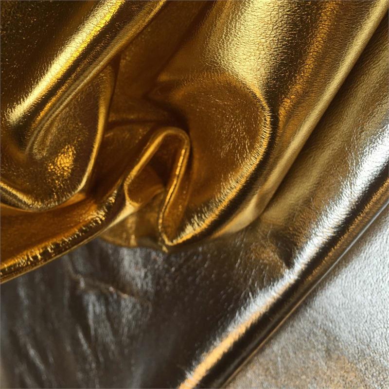 Foiled lambskin, very soft, very shiny, approximately 9 square feet and irregular in shape with natural variation in texture.