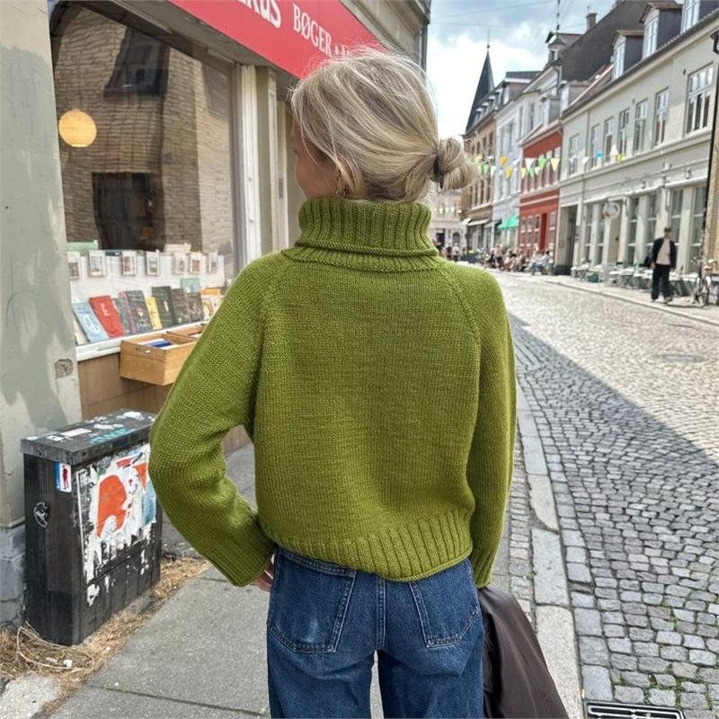 The green Amy Sweater is knitted in Peer Gynt by Sandnes Garn in the color Matcha [9564].